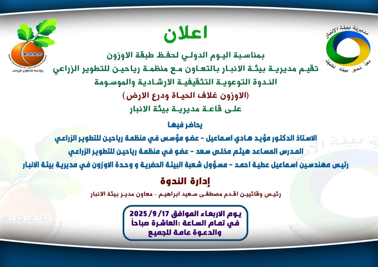 The Rayahin Organization for Agricultural Development, in cooperation with the Anbar Environment Directorate, held an awareness-raising workshop entitled "Ozone: The Shell of Life and the Earth's Shield." The workshop was held in the conference hall of the Anbar Environment Directorate. The workshop featured introductory and awareness lectures on the role of the ozone layer in preserving life and the Earth's environmental and biological diversity. It also highlighted international agreements, government measures, and civil society organizations involved in preserving it. The workshop included scientific presentations, dialogues, and discussions that enriched the topic. The workshop concluded with recommendations aimed at preserving ozone and reducing the use of CFCs, which exacerbate the ozone hole and limit its expansion. The workshop was well-received and welcomed by the attendees. #Rayahin_Organization_for_Agricultural_Development
